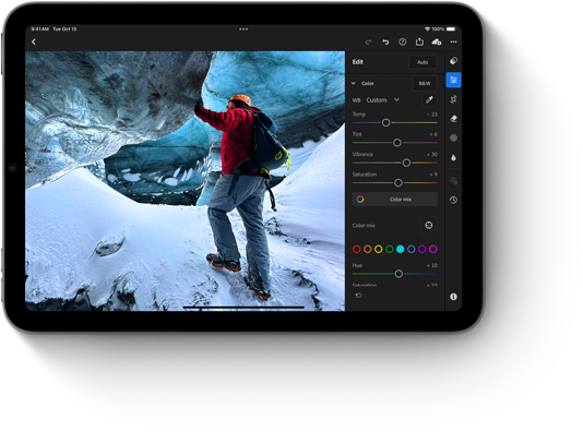 Ein iPad mini im Hochformat zeigt einen farbigen Adobe Photoshop Bildschirm.