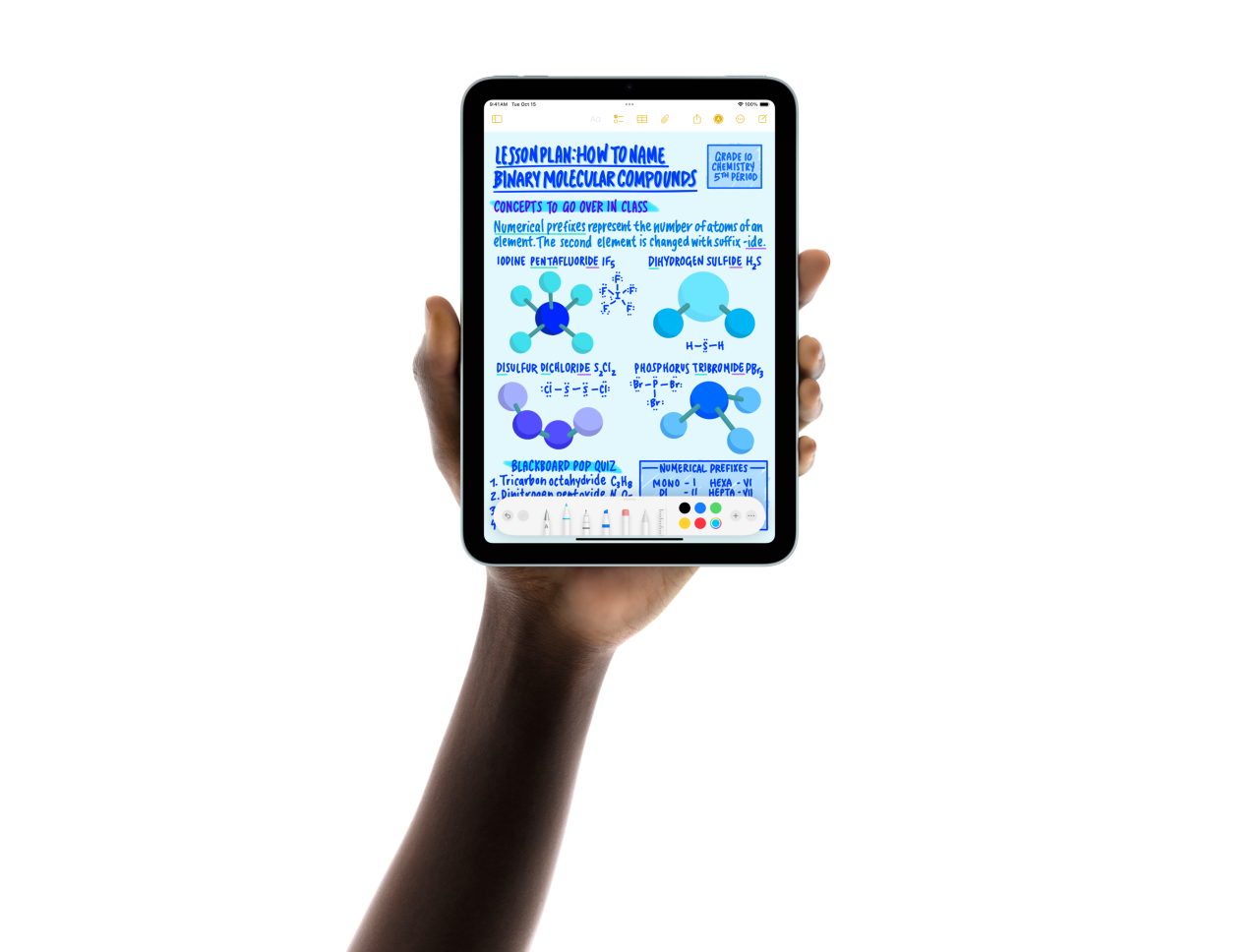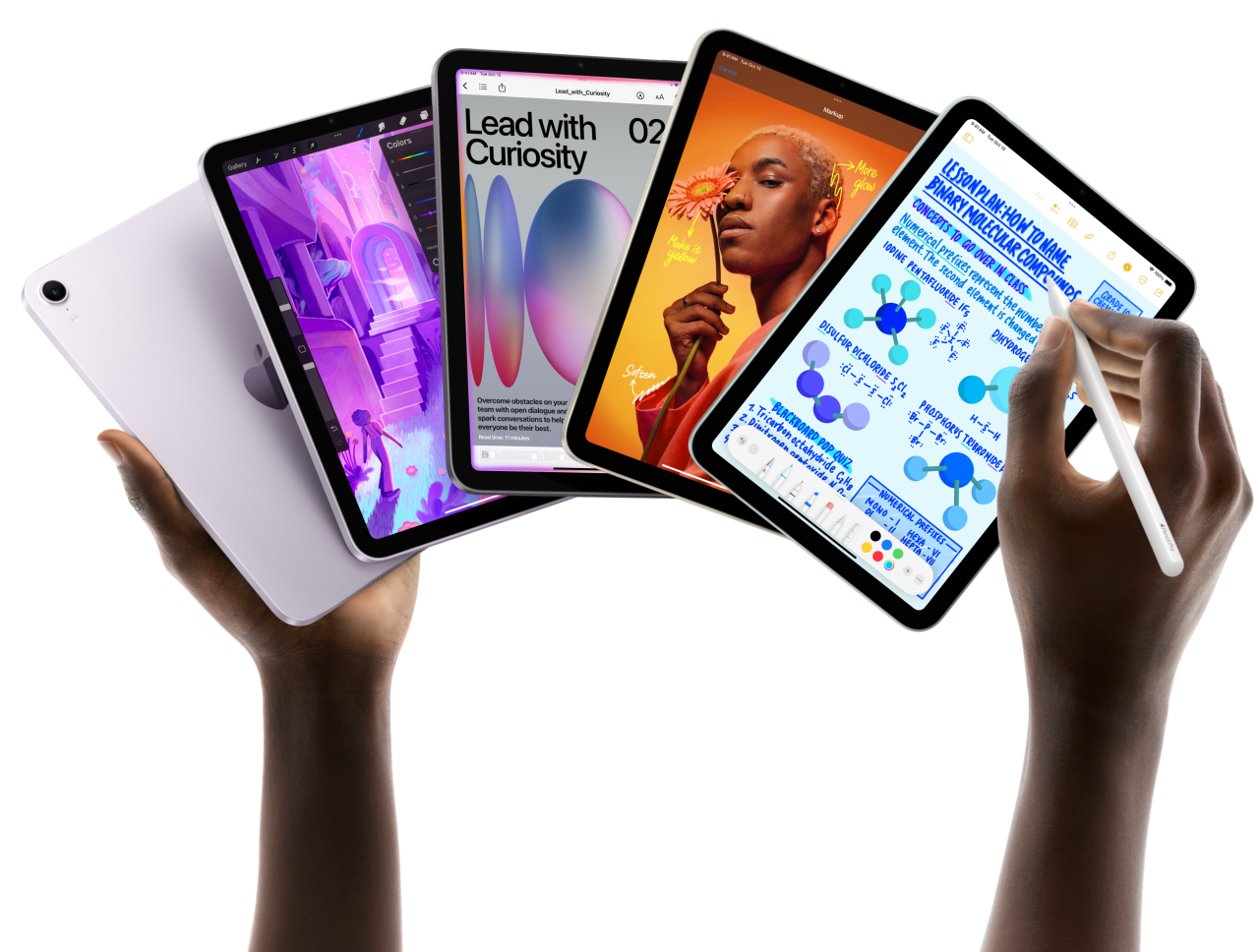 Five iPad mini models are shown in a fan formation held by a user's hands. One model shows the back camera, the other four are front facing. Apple Pencil Pro is being used to take notes.