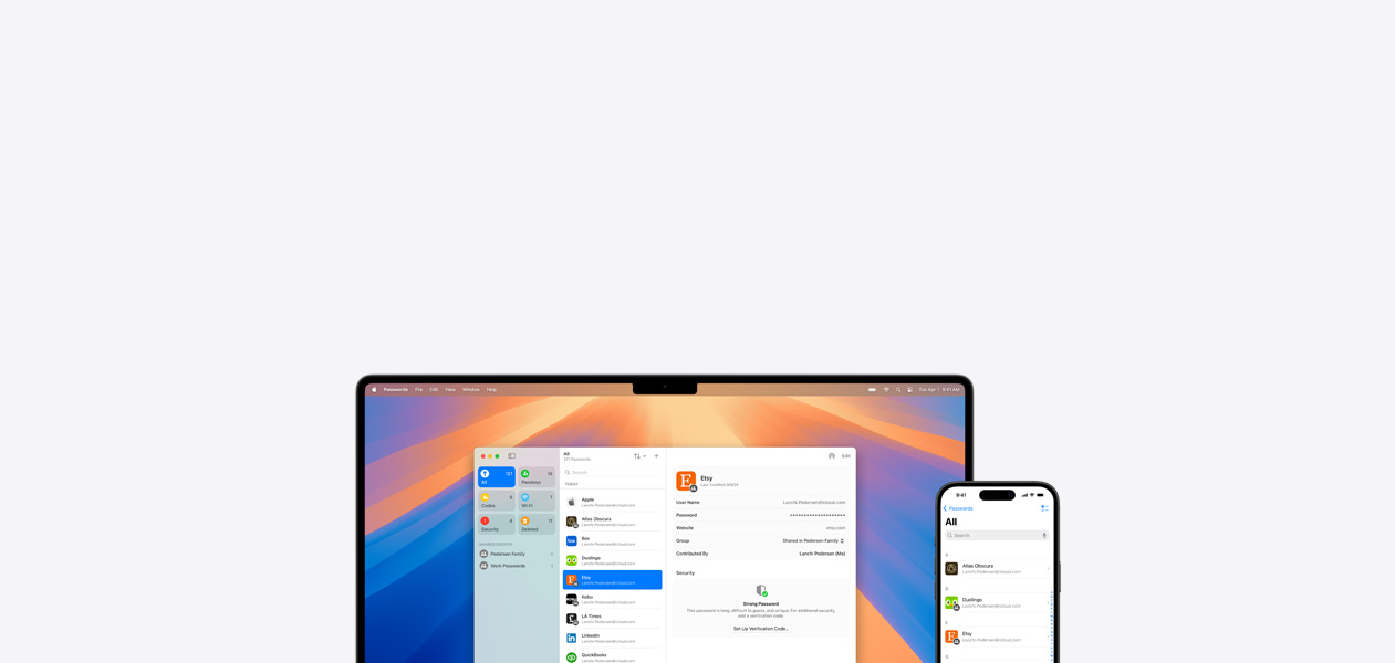 Aplikasi Kata Sandi memungkinkan Anda mengakses kata sandi akun, kunci sandi, kata sandi Wi‑Fi, dan kode verifikasi — semuanya di satu tempat. Aplikasi ini membantu mengelola kredensial di semua perangkat dengan iCloud dan memberi tahu Anda jika ada kata sandi yang tidak aman. Anda bisa membuat, menyimpan, dan menyesuaikan kata sandi yang kuat, membagikannya dengan orang lain, dan banyak lagi.