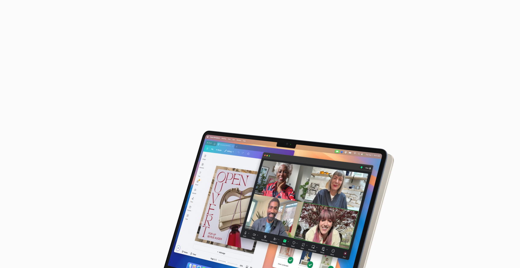 Partially open 13-inch and 15-inch MacBook Air  — one screen shows design work in progress, the other shows multitasking across email and spreadsheets