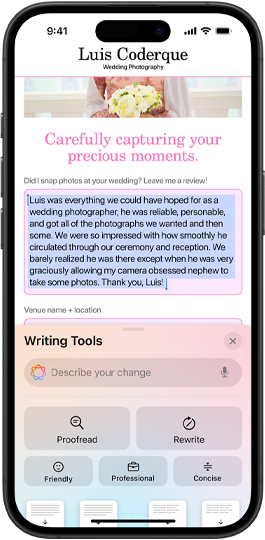 Transform how you communicate using intelligent Writing Tools that can proofread your text, rewrite different versions until the tone and wording are just right, and summarize selected text with a tap. Writing Tools are available nearly everywhere you write, including third-party apps.