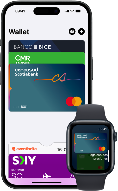 Configúralo en segundos desde tu iPhone. Apple Pay está integrado en el iPhone y el Apple Watch. Para comenzar en tu iPhone, abre la app Wallet y toca el símbolo más. Agrega una tarjeta de crédito o débito con sólo tocar la parte posterior de tu iPhone con la tarjeta elegible.1 Tendrás la opción de agregar la tarjeta a tus otros dispositivos al mismo tiempo. Cuando quieras pagar, sólo tienes que hacer doble clic, dar un toque y listo. Y no te preocupes por las recompensas y los beneficios de tu tarjeta: tus valiosos puntos y millas siguen acumulándose.