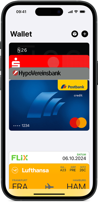 Einrichten in Sekunden. Direkt auf deinem iPhone. Apple Pay ist in deinem iPhone, Mac und iPad sowie deiner Apple Watch und Apple Vision Pro bereits integriert. Füge einfach deine Kredit- oder Debitkarte in der Wallet App auf deinem iPhone hinzu und schon kannst du loslegen. Du bekommst nach wie vor Prämien und Vorteile deiner Karte und dir entgehen keine deiner gesammelten Punkte oder Meilen.
