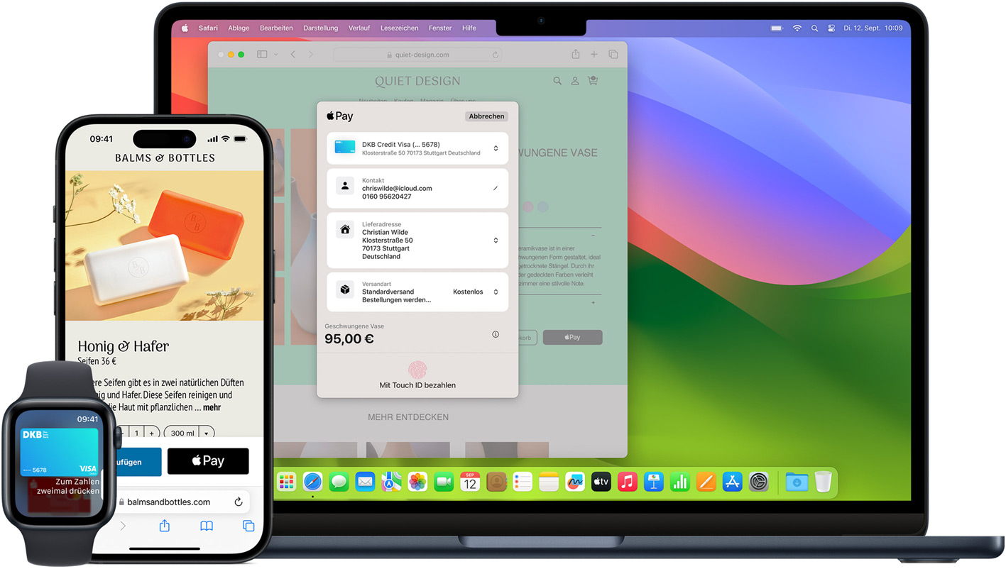 In Apps und online. Verwende Apple Pay für nahtlose Einkäufe in Safari und anderen Browsern. Auf dem iPhone, iPad, Mac und anderen Computern. Und ohne komplizierte Bezahlformulare. Klicke oder tippe auf einem Apple Gerät auf die Apple Pay Taste und bezahle per Touch oder mit einem Blick. Auf Geräten anderer Hersteller kannst du den Apple Pay Code mit deiner iPhone Kamera scannen und deinen Einkauf über dein iPhone abschließen.1 Oder nutze Apple Pay, um Abos für Services wie Apple Music und Apple TV+ abzuschließen, Apps und Spiele im App Store zu kaufen oder ein Upgrade für deinen iCloud Speicher zu machen.