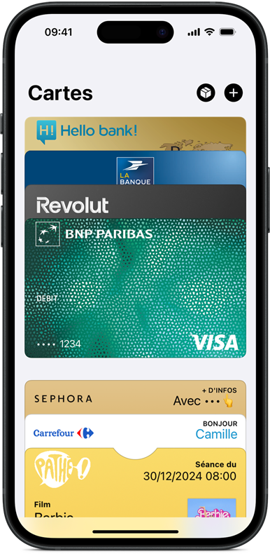 C’est tout simple. Il vous suffit d’ajouter votre carte de crédit, de débit ou carte prépayée dans l’app Cartes sur votre iPhone. Veillez également à ajouter vos cartes à tous les autres appareils Apple que vous souhaitez utiliser avec Apple Pay. Ce service fonctionne sur iPhone, Apple Watch, Mac, iPad ou Apple Vision Pro. Si vous passez à un nouvel iPhone, vous pouvez automatiquement y transférer vos cartes en une seule étape simple.