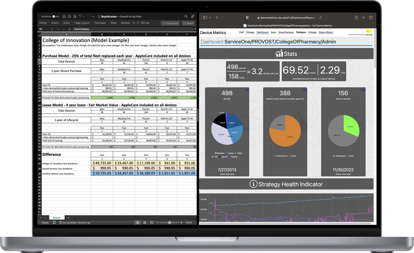 MacBook Pro。不論是進行數據處理或將資料視覺化,Mac 的效能都能為 Adams 的分析工作提供強勁動力。分割顯示功能可透過優雅的方式同時展示 Excel 內的數據,以及肯塔基大學的科技效能儀表板。