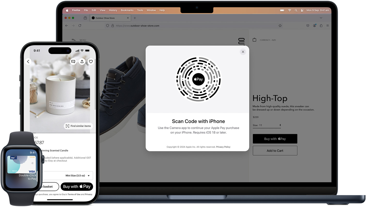 In apps and online. Use Apple Pay to seamlessly make purchases in Safari and other browsers — on iPhone, iPad, Mac and other computers — without the lengthy check-out forms. On an Apple device, click or tap the Apple Pay button and pay with a touch or glance. On a non-Apple device, scan the Apple Pay code with your iPhone camera and use your iPhone to complete your purchase.2